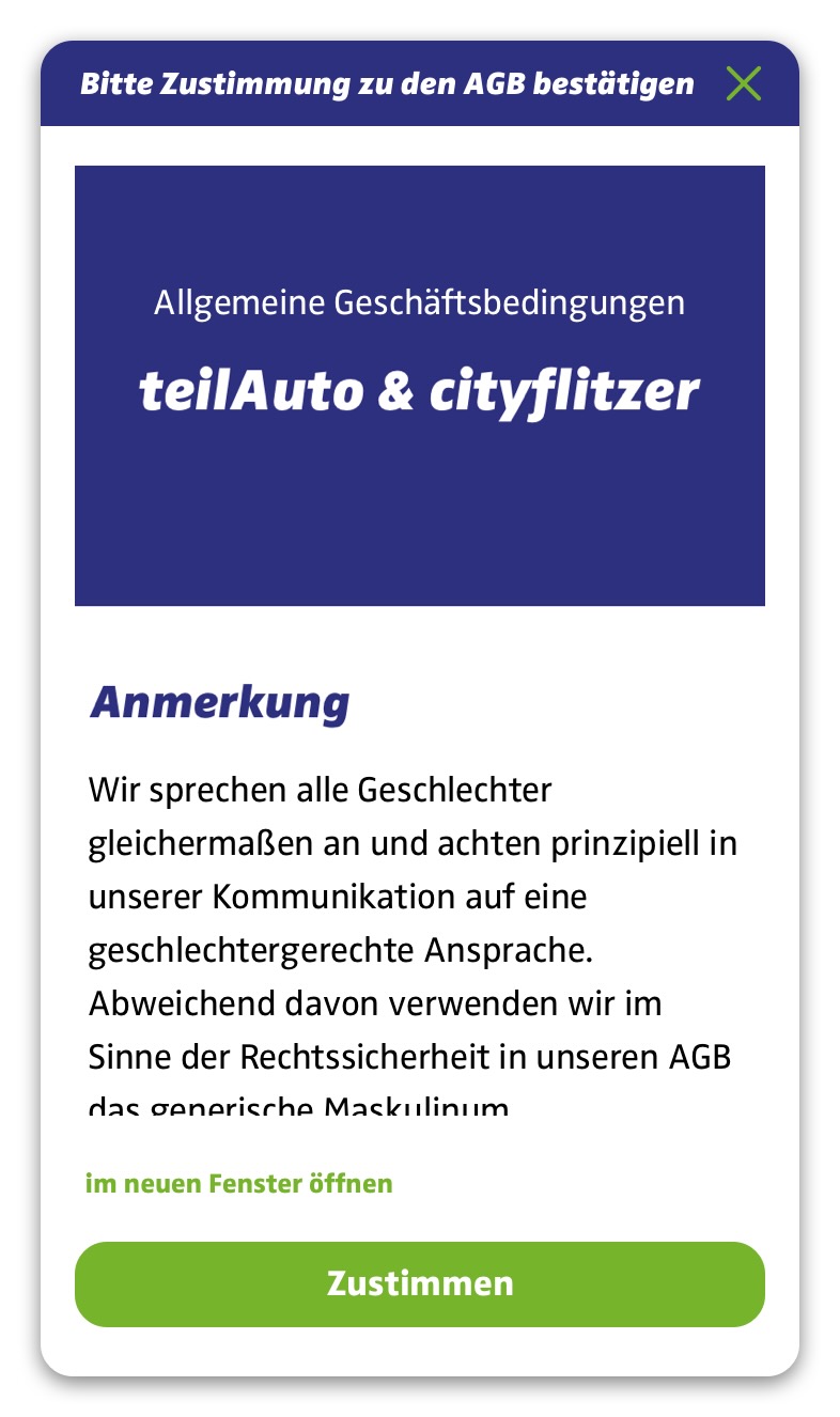 Loggen Sie sich unter buchen.teilauto.net oder in Ihrer App ein. Hier erscheint ein Popup-Fenster, in welchem Sie den AGB zustimmen können. Wenn Sie schon eingeloggt sind und das Fenster zur AGB-Bestätigung nicht sehen sollten, loggen Sie sich bitte noch einmal aus und wieder ein.