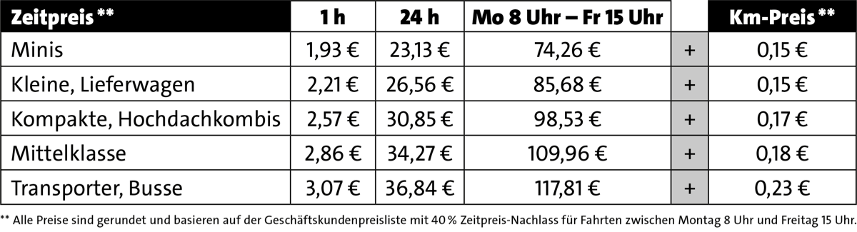 Die Zeit- und Km-Preise gelten für Fahrten zwischen Montag 8 Uhr und Freitag 15 Uhr. Die Tankkosten sind im Km-Preis bereits enthalten. Der einmalige Startpreis pro Person ist auf 10 € reduziert. Es gibt keinen monatlichen Grundpreis.