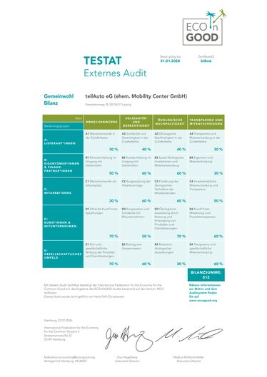 Großes Thema diesmal war natürlich der Formwechsel zur Genossenschaft. Dadurch ist auch der Titel etwas verwirrend: „Gemeinwohl-Bericht teilAuto eG (ehem. Mobility Center GmbH)“. Das ist nämlich der Clou: Wir berichten jetzt als teilAuto eG, aber für einen Zeitraum (2022-24) in welchem wir noch Mobility Center GmbH hießen. Das war auch für den Auditor etwas Neues. Wir sind gespannt, wie es weitergeht. Aber erstmal: viel Spaß beim Lesen :-)