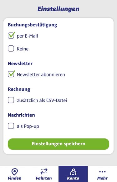 Hierfür ist es wichtig, dass ihr die Zusendung von Buchungsbestätigungen aktiviert habt. Dies könnt ihr ebenfalls bequem in der App erledigen: