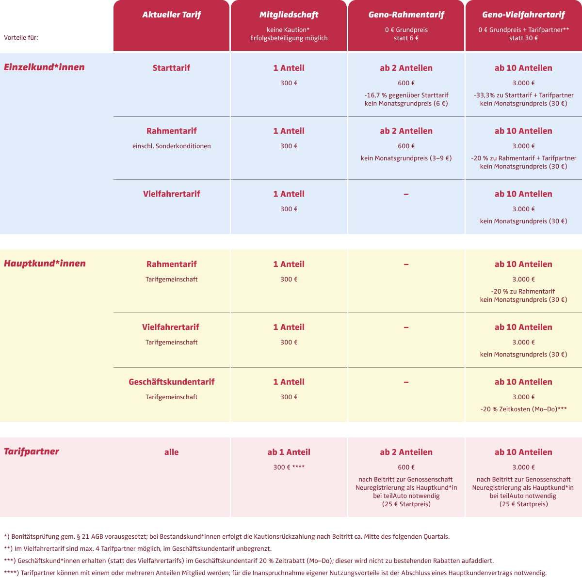 Ab 10 Anteilen können Tarifgemeinschaften den Vielfahrertarif (-20 % auf Zeit und km) ohne den Monatsgrundpreis von 30 € in Anspruch nehmen. Hier sind bis zu vier Tarifpartner*innen möglich. Wichtig: Die*der Hauptvertragsnehmende muss Mitglied sein und alle Anteile selbst zeichnen. Ein „Splitting“ von Anteilen über mehrere Köpfe – etwa die Tarifpartner*innen – ist (auch genossenschaftsrechtlich) nicht möglich. - Hauptkund*innen im Geschäftskundentarif
