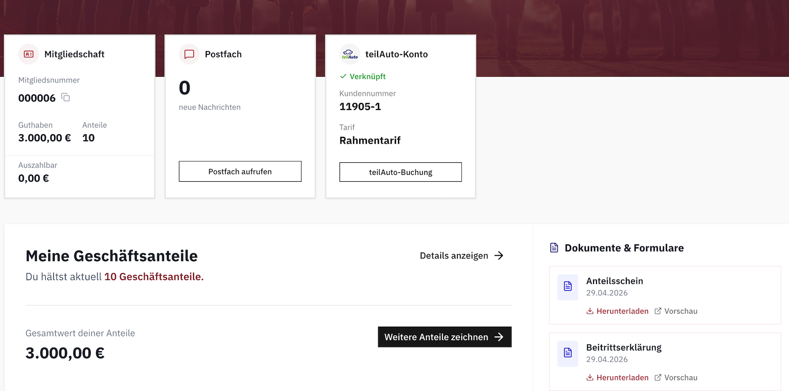 Im Anschluss kannst Du im Mitgliederbereich deine Mitgliederdaten verwalten, dein Geschäftsguthaben einsehen, weitere Anteile zeichnen und Mitteilungen abrufen.